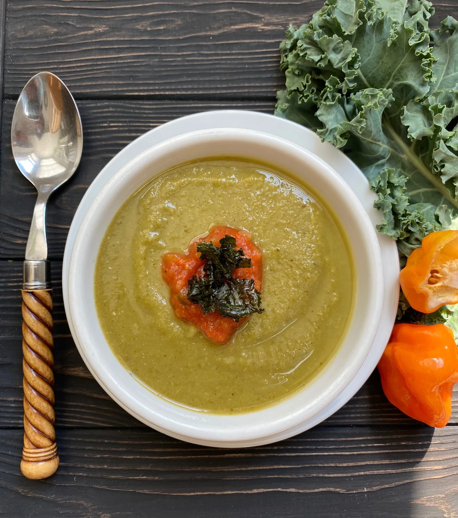 Split Pea and Kale Soup with a hint of Scotch Bonnet pepper